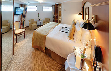 Located on the Ruby Deck, Category 4 cabins feature a double bed with optional twin-bed configuration with 400 thread count cotton linens/white duvets and pillows of mako cotton with hypoallergenic 90% down filling. The marble bathroom includes Molton Brown toiletries and a terry-cloth bathrobe plus slippers. The room also includes a floor-to-ceiling French Balcony with a sliding door, a refrigerator stocked with complimentary water and soft drinks replenished daily. Amenities also include a 32” LED TV, two chairs plus a desk, a built-in closet with drawers, as well as a telephone, safe, and individual climate control. Wi-Fi is also available onboard.