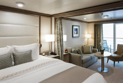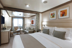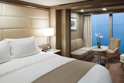 A quiet sanctuary to escape to on your cruise. The sitting area has plenty of room to relax. Large picture windows frame panoramic ocean views. The perfect backdrop for breakfast in bed.Guests can expect a large picture window providing panoramic views, twin beds or queen-sized bed, a shared teak veranda and floor-to-ceiling glass doors, sitting area, a marbled bathroom with double-vanity, a separate shower and a full-sized bathtub. A walk-in wardrobe with personal safe is provided along with a radio/alarm with iPod docking station, direct-dial telephone and a refrigerator and bar setup, stocked with your preferences. Pratesi® fine bed linens and down duvet covers, premium mattresses and a choice of pillows, Plush robes and slippers, BVLGARI® bath amenities or a choice of European bath amenities, vanity table(s) with hair dryer, writing desk(s) with personalised stationery, binoculars, and umbrella, WiFi access, flat screen TV(s), on-demand movies, and satellite news, and dry cleaning and pressing service (fee applies).