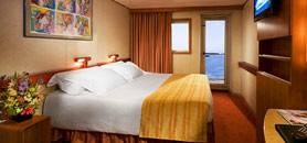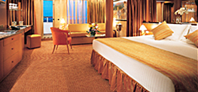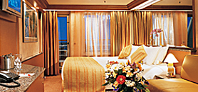 These extra-large accommodations have a separate sitting area and private balcony. Special features include a large vanity/dressing table, refrigerator and entertainment area, VCR and access to an extensive video library, whirlpool bath and walk-in closet.