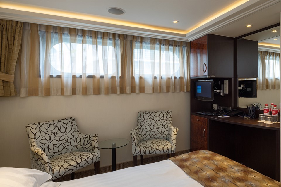 Located on the Piano Deck with a fixed windowFeatures include:   In-room temperature control Deluxe hotel-style bedding with Egyptian linen, down pillows and duvet Spacious bathrooms with multi-jet showerheads Large wardrobe, full-length mirror, hair dryer, safe and direct-dial telephone Flat-screen TV that also works as a computer Entertainment on Demand system providing complimentary TV, movies and music library Complimentary internet and Wi-Fi Complimentary bottled water replenished daily Desk and chair